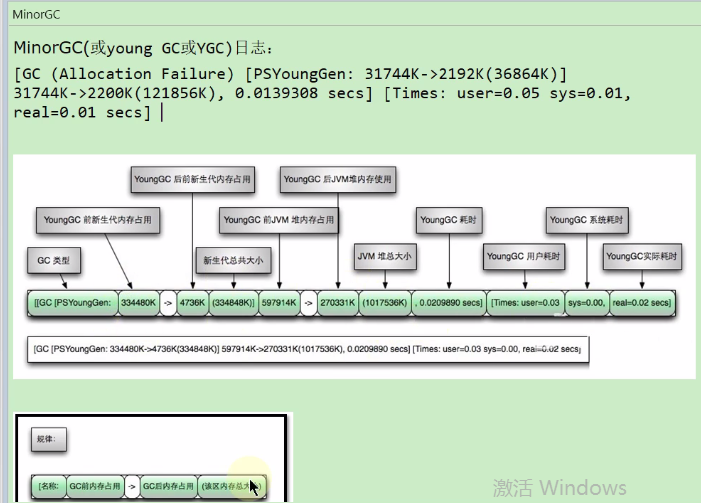 是PSYoungGen ·使用Parallel old Generation收集器在老年代的名字是”[ParoldGen”·使用G1收集器的话,会显示为"garbage-first heap" Allocation Failure 表明木次引起GC的原因是因为在年轻代中没有足够的空间能够存储新的数据了。通过图示,我们可以发现GC日志格式的规律一般都是:GC前内存占用一>GC后内存占用(该区域内存总大小)
